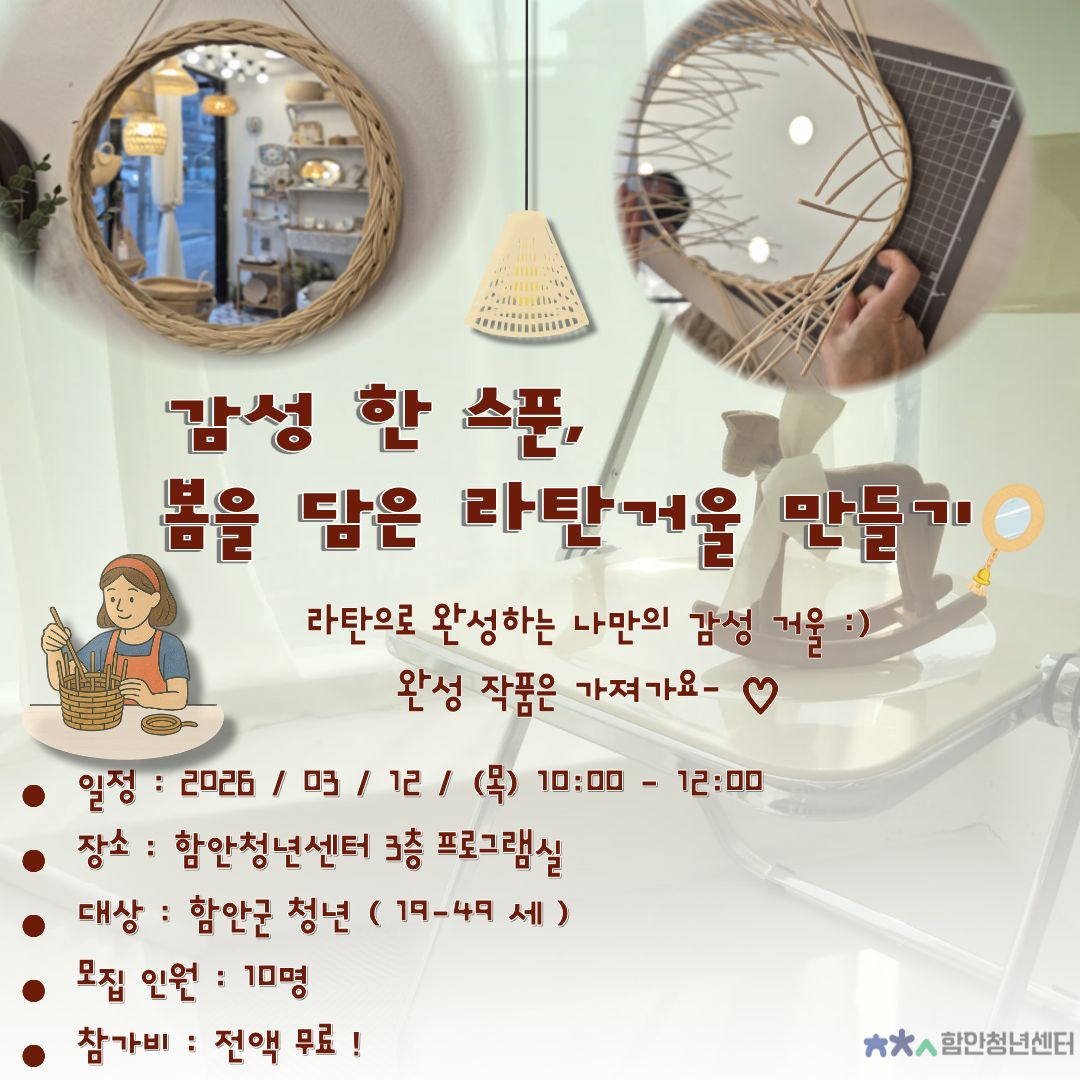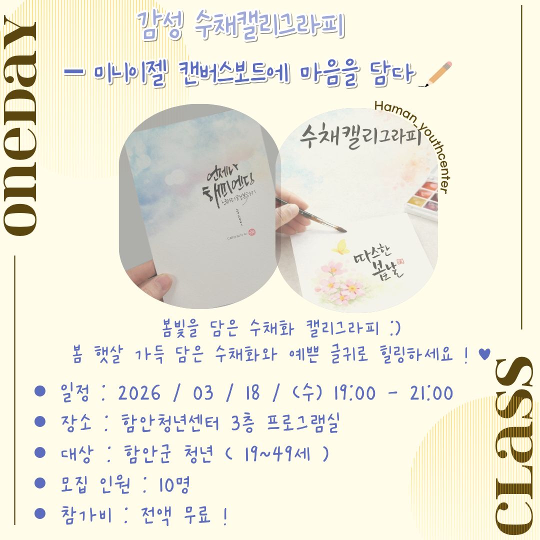 ![]() ![]() ![]() ![]() ![]() 2026년 3월 원데이클래스를 이와 같이 시행하오니, 관심있는 청년들의 많은 신청바랍니다 :) -수강대상: 함안군 청년 (19세~49세) -모집기간: 2026. 02. 23(월) ~ 2026 .02 .27(금) -신청: 2026. 02. 23(월) 오전 10시부터 신청 가능! 함안청년센터 홈페이지 內 "원데이클래스" 클릭. -결과: 선정된 분께만 문자 개별 전송. ※ 선착순/신규 참여자 우선이며, 문자를 못 받으신 분들께서는 다음에 참여 부탁드립니다. ※ 함안청년센터 홈페이지 내 공지사항의 "NO-SHOW 안내문"도 필독 바랍니다. ※ 강의일정 및 모집인원은 사업예산에 따라 변동될 수 있음. -문의: 055-585-8311~3 |
