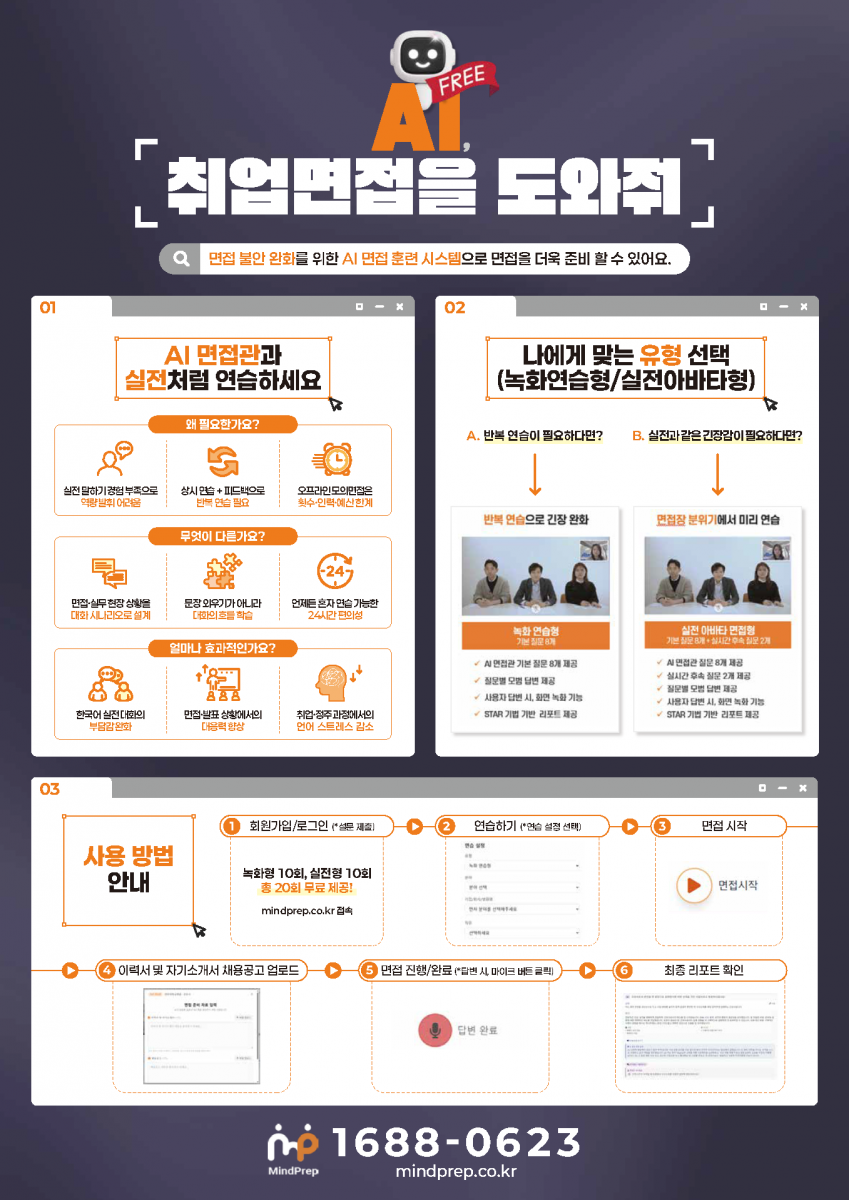 ![]() 온라인 모의면접 무료 체험하기>> mindprep.co.kr ( • ᎑ •) 면접은 말 잘하는 사람이 아니라, 실전처럼 준비한 사람이 합격합니다.