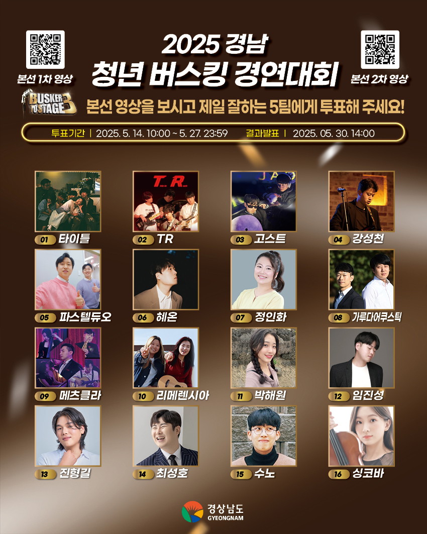 경남도에서는 청년 버스킹 문화 활성화 및 청년문화 향유기회 확대를 위하여 '2025 경남 청년 버스킹 경연대회'를 추진하고 있습니다. 지난 5월 10일과 11일에 본선을 개최하고 5월 27일(화)까지 온라인 투표를 진행하고 있습니다. 관심있으신 분께서는 온라인 투표에 많이 참여 바랍니다.