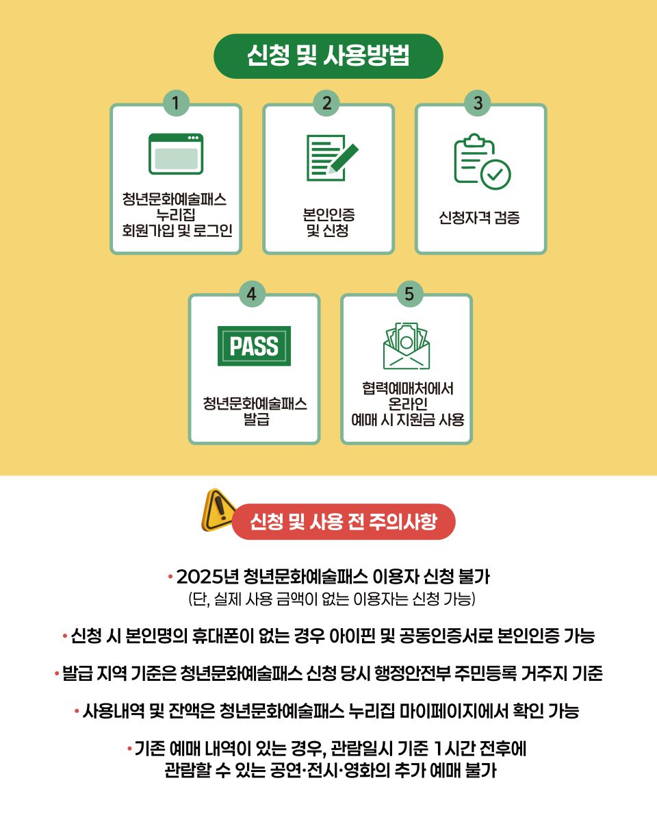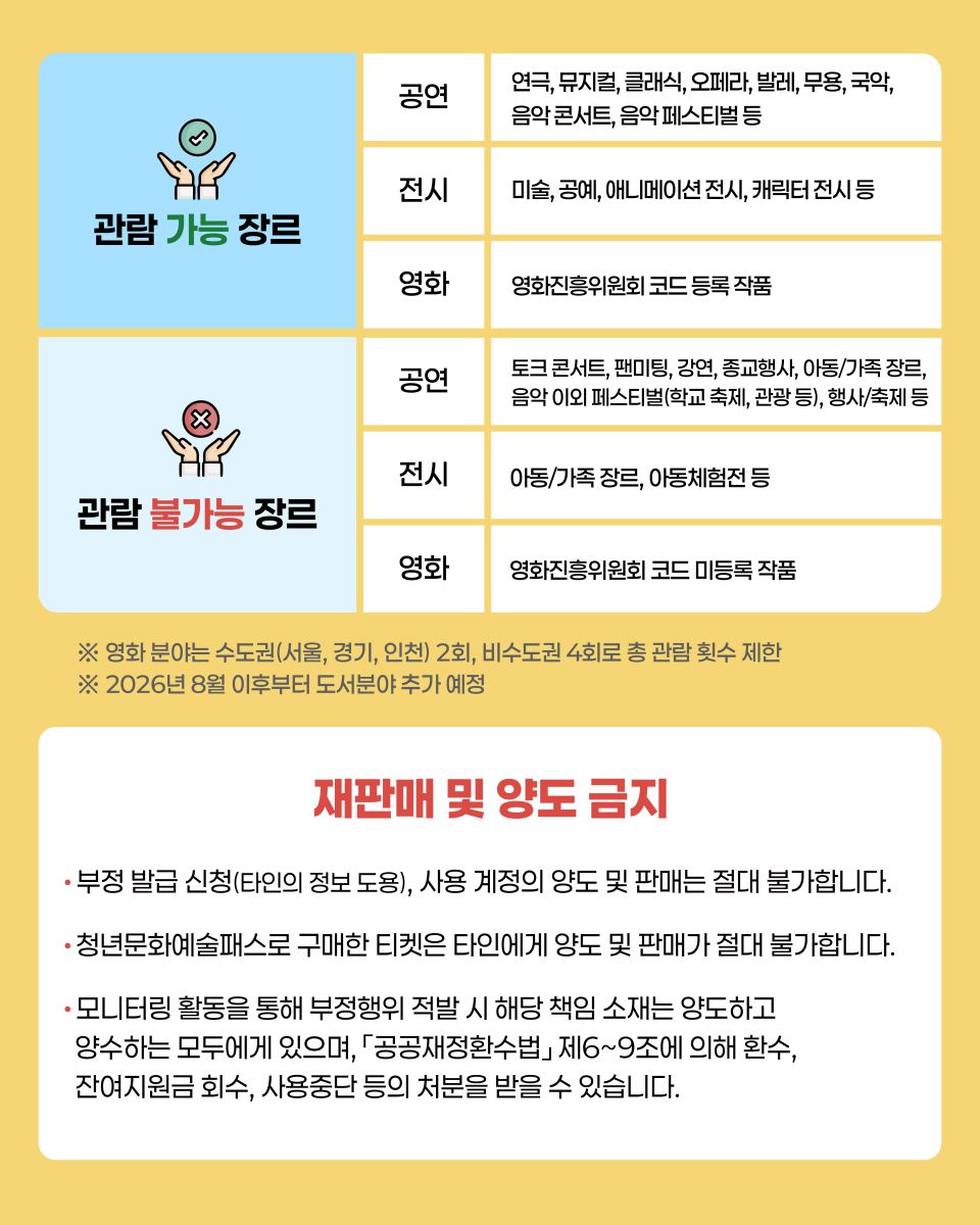 ![]() ![]() ![]() ![]() ![]() ![]() ![]() ![]() <2026년 청년문화예술패스 사업 안내> 청년의 문화향유 기회 확대와 문화소비 주체로서의 성장을 위한 『2026년 청년문화예술패스』사업을 진행하고 있습니다. 해당되는 청년들의 많은 참여바랍니다. ○ 신 청 일: 1차 2.25.(수)~6.30.(화) / 2차 8.10.(월)~11.30.(월) => 1차 발급 후 7.31.(금)까지 미사용시, 이용자 지원금 회수(재신청 불가) ○ 사 업 량: 310명 (선착순 발급) ○ 지원대상: 19세~20세 청년 (2006년~2007년 출생자) ○ 지원내용: 1인 20만원의 포인트 지급 ○ 신청방법: 청년문화예술패스 누리집 (https://youthculturepass.or.kr/)에서 회원가입 후 신청 ○ 사용방법: 협력예매처(yes24, Melon티켓 등)로 등록된 공연·전시·영화 관람권 예매 시 발급받은 포인트를 사용 ○ 상세문의: 1577-1968, 누리집 1:1 온라인 문의 |