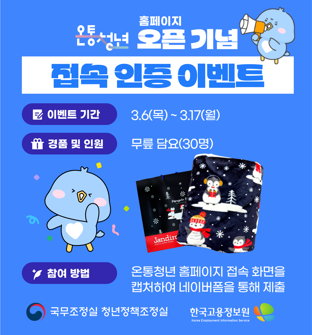 온통청년에서 재단장을 기념하여, 홈페이지 접속을 인증해 주시는 분들께 추첨을 통해 소정의 경품을 드리는 이벤트를 진행하고 있어 여러분들께 공유드립니다. - 참여 방법 : 온통청년 홈페이지 화면을 캡처하여 아래의 네이버 폼 주소를 통해 제출 (*선택 사항) 청년신문고 의견 등록 및 인증을 함께 할 경우 당첨 확률이 높아집니다. - 참여 기한 : 3월 6일(목) ~ 3월 17일(월) - 제출기한 : ~25.3.17(월) - 네이버 폼 주소 : https://form.naver.com/response/YwwC5pQYk_FzU5fFtibRHA - 경품 및 추첨 인원 : 무릎담요(30명) 많은 참여와 관심 부탁드립니다. |