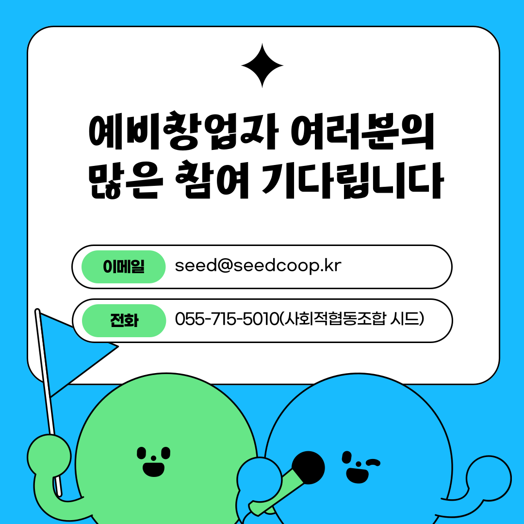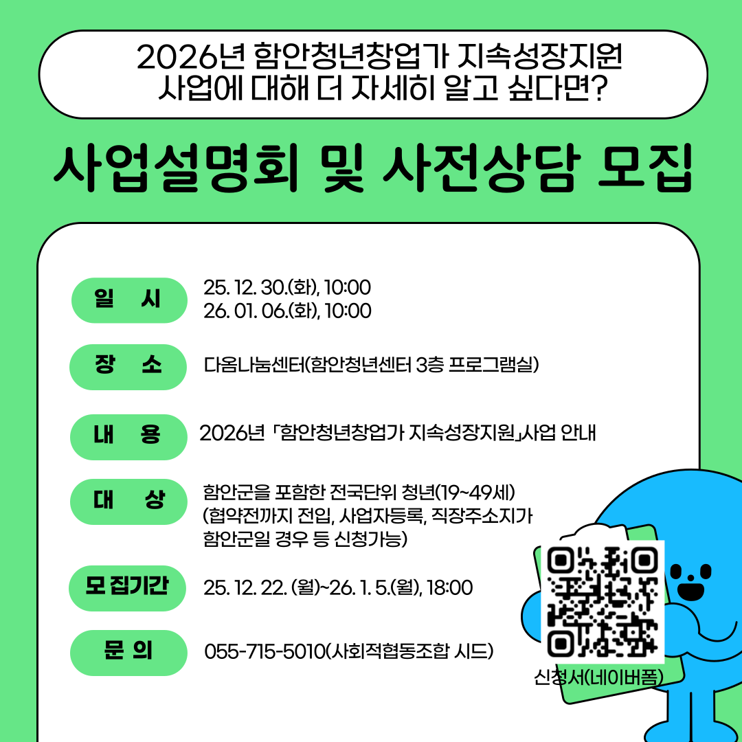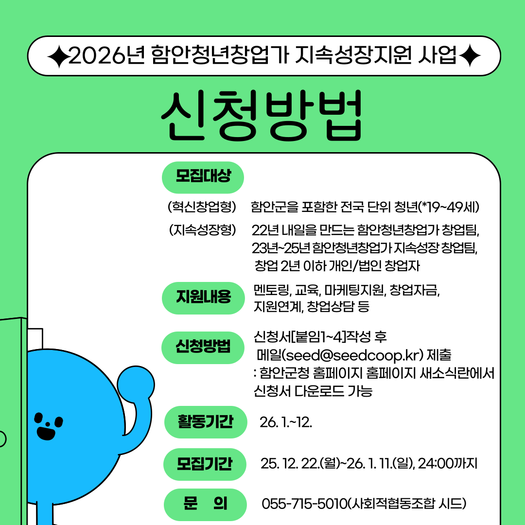 2026년 함안청년 창업가 지속성장지원사업' 참가자 모집 및 사업설명회 안내입니다. 많은 참여 부탁드립니다. ○ 모집기간 : 2025. 12. 22.(월) ~ 2026. 1. 11.(일) 24:00까지 ○ 신청대상 ※ 협약전(2026년 5월 말)까지 전입, 사업자등록 및 직장주소지가 함안군일 경우 신청가능 - 혁신창업형 : 함안군을 포함한 전국단위 청년(만19~49세) 중에서 사업자등록이 없거나 1년 이내 개인사업자로 등록된 자 - 지속성장형 : 22년 내일을 만드는 함안청년창업가 창업팀, 23~25년 함안청년창업가 지속성장지원사업 창업팀, 창업 2년 이하 개인 또는 법인 창업자 ○ 사업설명회 및 사전상담 : 2025. 12. 30.(화) 10:00 / 2026. 1. 6.(화) 10:00 (함안청년센터(가야읍 중앙북길 86, 다옴나눔센터 3층) 프로그램실) ○ 신청방법 : 신청서(첨부파일) 작성 후 메일 제출(seed@seedcoop.kr) ○ 문 의 : 사회적협동조합 시드 창업지원팀(055-715-5010) |