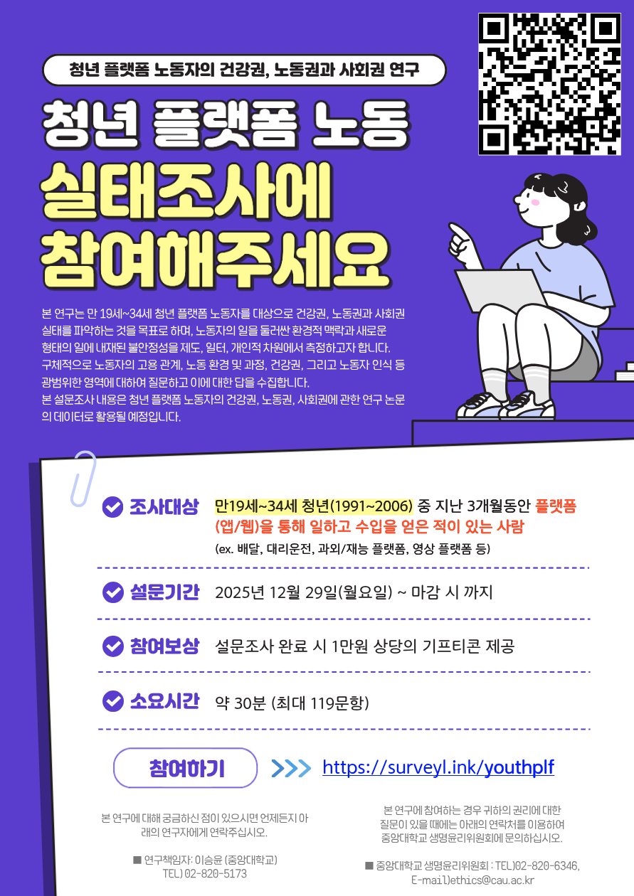 만 19세~34세 청년 플랫폼 노동자를 대상으로 노동자의 일을 둘러싼 환경적 맥락과 새로운 형태의 일에 내재된 불안정성을 제도, 일터, 개인적 차원에서 측정하고자 진행되는 청년 플랫폼 노동 실태조사에 청년분들의 적극적인 참여를 부탁드립니다. 조사대상: 만 19세~34세 청년(1991~2006) 중지난 3개월 동안 플랫폼(앱/웹)을 통해 일하고 수입을 얻은 적이 있는 사람 (ex. 배달, 대리운전, 과외/재능 플랫폼, 영상 플랫폼 등) 설문기간: 2025년 12월 29일 ~ 마감 시 까지 참여보상: 설문조사 완료 시 1만원 상당의 기프티콘 제공 소요시간: 약 30분 (최대 119문항) 연구책임자: 중앙대학교 사회복지학과 이승윤 교수 참여하기: https://surveyl.ink/youthplf* 본 설문조사 내용은 청년 플랫폼 노동자의 건강권, 노동권, 사회권에 관한 연구 논문의 데이터로 활용될 예정입니다. |