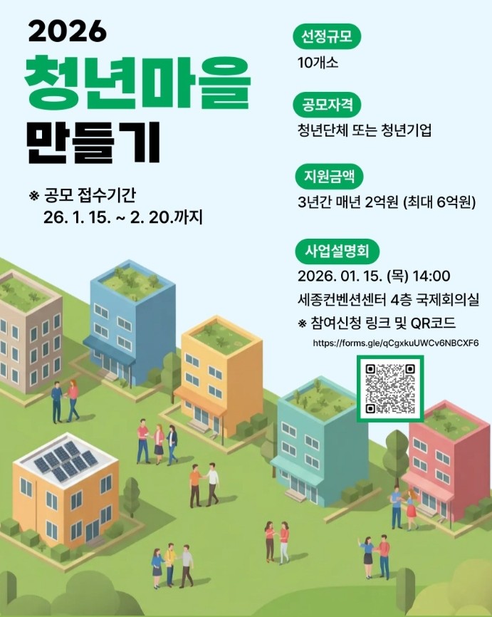 ![]() 2026년 신규 청년마을 공모 및 사업설명회 2026 청년마을 만들기 사업설명회 일시: 2026. 01. 15. (목) / 14:00 장소: 세종컨벤션센터 4층 국제회의실 ☑️사업목적 특색있는 청년마을을 조성해 지방소멸 대응 및 지역 활력 증진 공모 접수기간 2026. 1. 15. ~ 2. 20. 1️⃣선정규모 - 10개소 2️⃣공모자격 - 청년단체·청년기업 3️⃣지원금액 - 청년마을별 6억원(3년간 매년 2억원) ※ 자세한 사항은 행정안전부 누리집 참조 (「2026년 청년마을 만들기 사업」 공모 안내 | 행정안전부> 뉴스·소식> 새소식> 알립니다) 또는 붙임파일 참조바랍니다.^^ |
