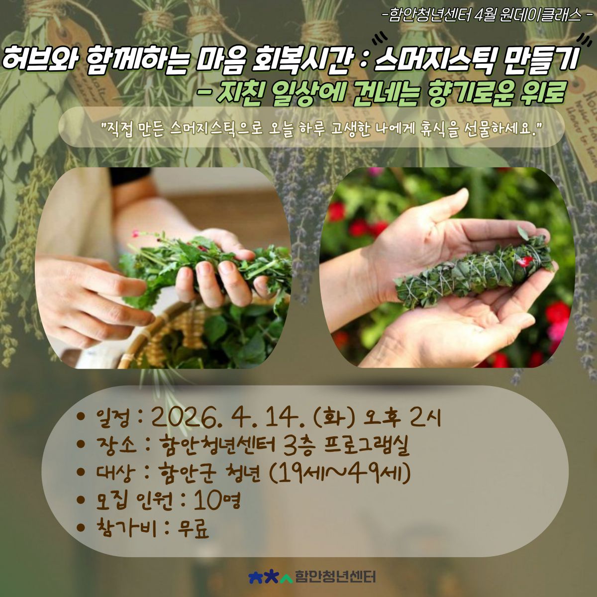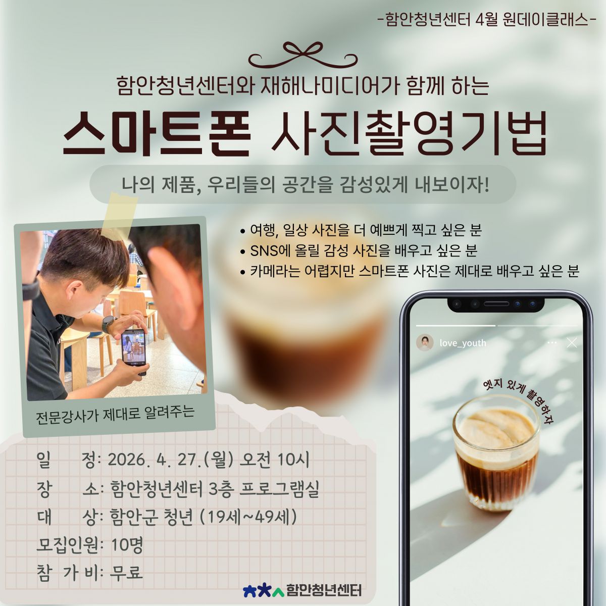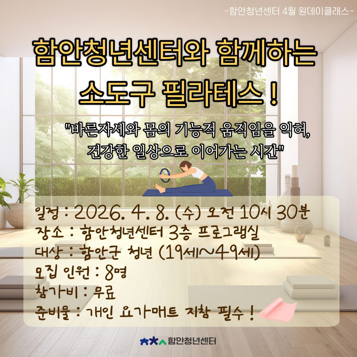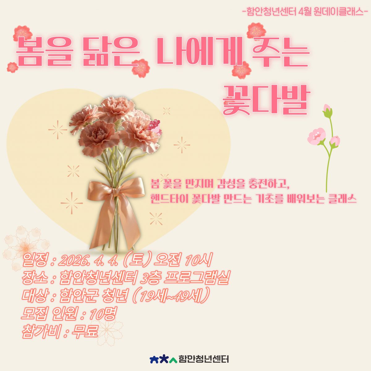 ![]() ![]() ![]() ![]() ![]() ![]() 2026년 4월 원데이클래스를 이와 같이 시행하오니, 관심있는 청년들의 많은 신청바랍니다 ♡゛ • 수강 대상: 함안군 청년 19세~49세이하 • 모집 기간: 2026. 3. 23 (월) ~ 2026. 3. 29 (일) 까지 • 신청 방법: 2026. 3. 23 (월) 오전 10시부터 신청가능 -! 함안청년센터 홈페이지 內 "원데이 클래스" 클릭 ※ 홈페이지 접수 시 성함과 연락처를 정확히 입력해주세요! 선정 안내는 문자로 발송되며, 정보가 정확하지 않을 경우 안내가 어려울 수 있습니다. • 결과: 선정된 분께만 문자로 개별안내. ※ 선착순 / 신규 참여자 우선이며, 문자를 못 받으신분들께서는 다음에 참여 부탁드립니다. ※ 함안청년센터 홈페이지 내 공지사항의 "NO-SHOW 안내문"도 필독 바랍니다. ※ 강의일정 및 모집인원은 사업예산에 따라 변동될 수 있음. ☏ 문의: 055) 585-8311~3 |