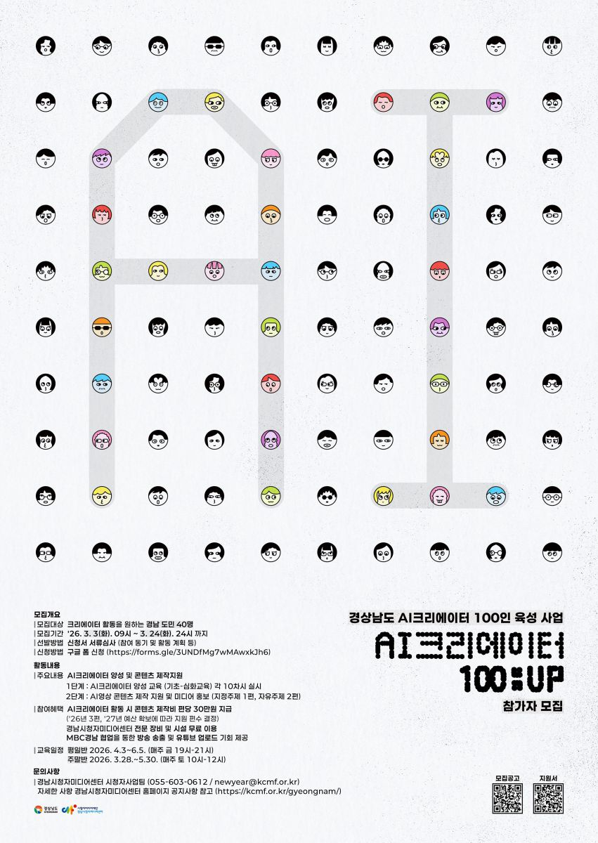 ![]() 경남시청자미디어센터에서는 경남형 AI영상크리에이터 인재 양성을 위한 "AI크리에이터 100인 육" 사업을 추진합니다. 이에 참가자 모집에 앞서 사업 취지와 참여 방법을 안내하기 위한 설명회를 아래와 같이 개최하오니, 관심 있는 도민 여러분의 많은 참여를 바랍니다. ○ 사업개요 o 사 업 명 : AI 미래 크리에이터 100 육성 사업 o 사업기간 : 2026년 ~ 2030년, 5년간 o 사 업 량 : 100인 ※ 1년간 20명 양성 o 사업대상 : 경남 도민 o 사업내용 : 지역 관광‧문화 소개, 지역문제 해결 등 경남형 AI 뉴 미디어 인재 육성 (경남 대표 영상 크리에이터 100인 선정) * 예시) 도내 정책사업, 문화예술행사, 관광 숏폼 제작, AI활용 지역콘텐츠 웹영화 제작‧배포 등 ○ 설명회 개요 o 일 시 : 3월 9일 (월) 14시-15시 30분 o 장 소 : 경남시청자미디어센터 3층 다목적홀 o 대 상 : 경남지역 청년단체 및 일반 시민 약 50명 내외 o 신청방법 : 구글 폼을 통한 사전 등록 (2월 25일 – 3월 5일) - https://forms.gle/cuUnTpw8vg1iMLo98 ○ 주요내용 o 수행기관 (경남시청자미디어센터) 소개 o AI크리에이터 100인 육성 사업 소개 및 참여방법 ○ 문의사항 o 경남시청자미디어센터 시청자사업팀 김신년선임 - 055-603-0612 / newyear@kcmf.or.kr o 자세한 사항 경남시청자미디어센터 홈페이지 공지사항 참고 -홈페이지 주소 https://kcmf.or.kr/gyeongnam/ |