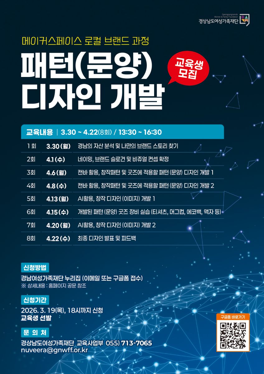 ![]() 경남의 문화자원을 지역문화 브랜드화 및 디자인제품으로 개발, 시제품 제작,포장까지 전과정을 수행하는 창작 실무 역량 강화를 위한 "메이커스페이스 로컬 브랜드 과정"을 진행하고자 합니다. ○ 공 고 명 : ♣ [패턴(문양) 디자인 개발] 교육생 모집 ♣ ○ 접수기간 : ~ 2026.03.19.(목) 18:00까지 ○ 결과발표 : 3.24(화)까지 개별 문자 ○ 자격요건 : 공고문 참고 ○ 신청방법 : 이메일접수 nuveera@gnwff.or.kr 또는 구글폼 접수 https://forms.gle/VHcqwyMEcuSXmAzV6