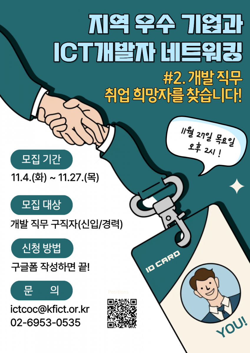 ![]() 「지역 우수 기업 × ICT개발자 네트워킹」 참여 희망하는 구직자 모집합니다! (~11.27.(목)) 개발 직무 취업을 준비 중인 여러분을 위해 네트워킹 자리를 준비했습니다! 이번 기회를 통해 지역 우수 기업 담당자와 직접 만나 기업의 근무환경·기술스택·채용계획까지 생생하게 확인해보세요. *신청 링크: https://forms.gle/ 행사 개요 2025년 11월 27일(목) 14:00~17:00 ICT콤플렉스 (서울시 마포구 마포대로 122, 프론트원 6층) 주요 내용 지역 우수 기업 채용 설명 및 소개 기업과의 네트워킹 (사전 매칭을 통한 그룹별 교류) 참가 대상 ICT개발자 및 구직자 지역 근무 또는 이직에 관심 있는 인재 참가 혜택 지역 우수 기업 담당자와의 현장 네트워킹 신청 기간 2025.11.4.(화) ~ 11.27.(목) 정오까지 구글폼 신청 https://forms.gle/ 문의 ICT콤플렉스 운영사무국 ictcoc@kfict.or.kr 02-6953-0535 기업과 인재가 맞닿도록, 당신의 커리어가 더 멀리 나아갈 수 있도록, 빠른 길을 만들어드리고 싶습니다. |
