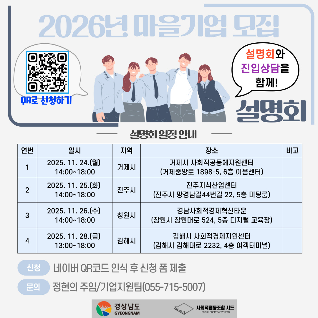 ![]() 2026년 마을기업 모집 공고가 11월 20일에 떴습니다. 마을기업 모집 공고만을 기다리신 분들이 많으실텐데요, 그래서 사회적협동조합 시드에서 2026년 마을기업 모집 설명회를 준비했습니다! 거제시, 진주시, 창원시, 김해시에서 설명회를 진행하오니 가까운 지역으로 오셔서 설명회에 참여해주시면 됩니다! 설명회가 끝난 뒤에는 사전 신청자에 한해 마을기업 진입 상담도 진행하니 관심있으신 분들께서는 참고부탁드립니다. 설명회와 진입상담 신청은 카드뉴스의 QR코드를 참고해주세요~! 문의사항이 있으시면 055-715-5007로 연락주시면 안내도와드리겠습니다.