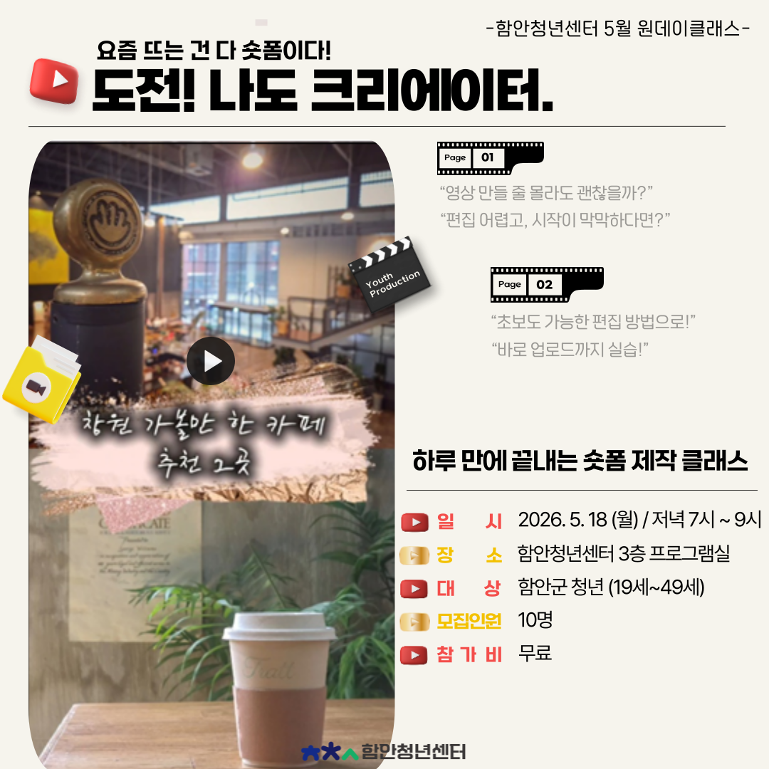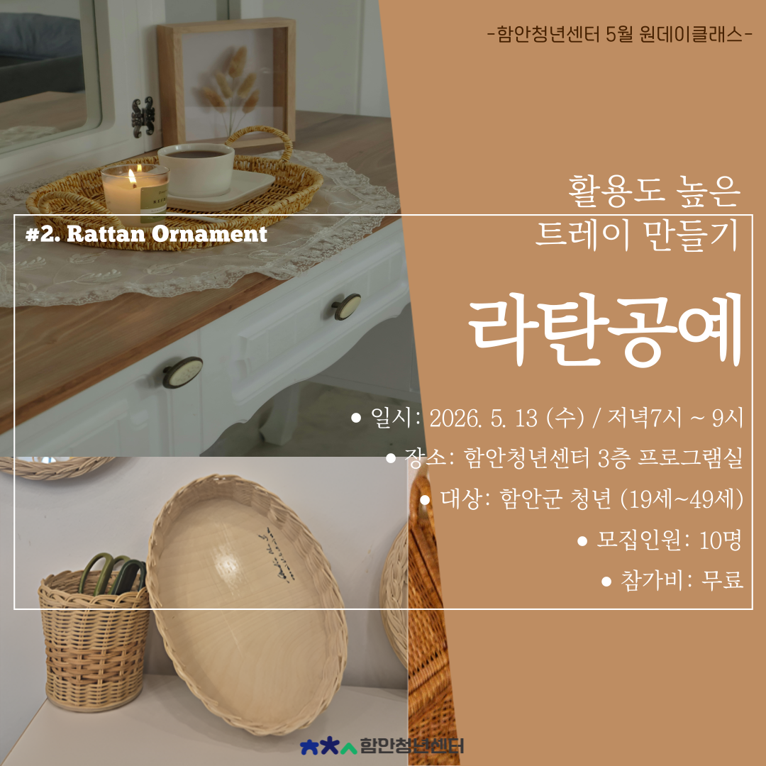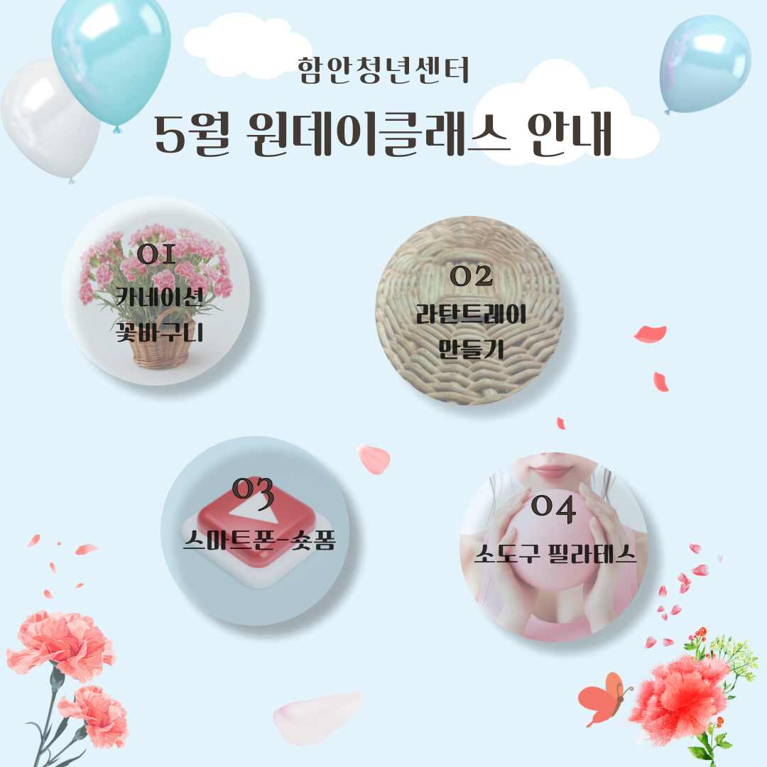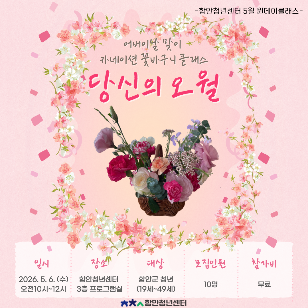 ![]() ![]() ![]() ![]() ![]() 2026년 5월 원데이클래스를 이와 같이 시행하오니, 관심 있는 청년들의 많은 신청 바랍니다 ♡゛ • 수강 대상: 함안군 청년 (19세 ~ 49세 이하) • 모집 기간: 2026.4.20 (월) ~ 2026.4.26 (일) 까지 • 신청 방법: 2026. 4. 20(월) 오전 10시부터 신청 가능 -! 함안청년센터 홈페이지 內 "원데이 클래스" 클릭 • 선정 결과: 센터에서 발송하는 '최종 승인 문자'를 받으셔야 클래스 참여가 확정됩니다. ※ 홈페이지 접수만으로는 확정이 아니며, 개별 안내 문자를 꼭 확인해 주세요! • 유의 사항: ※ 선착순 / 신규 참여자 우선이며, 선정된 분께만 문자로 개별 안내드립니다. ※ 정보가 정확하지 않을 경우 안내가 어려울 수 있으니 성함과 연락처를 꼭 확인해 주세요. ※ 함안청년센터 홈페이지 내 공지사항의 "NO-SHOW 안내문"도 필독 바랍니다. ※ 강의 일정 및 모집 인원은 사업 예산에 따라 변동될 수 있습니다. ☏ 문의: 055-585-8311~3 |