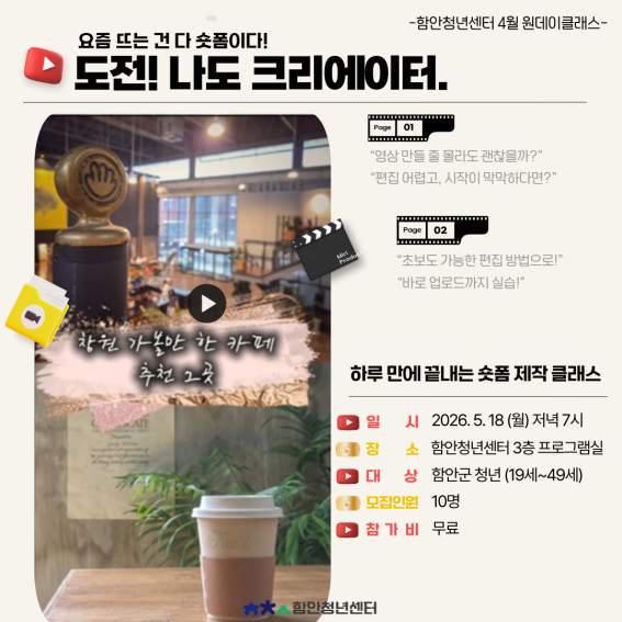 • 신청 방법: 2026. 4. 20. (월) 오전 10시부터 신청 가능-! 함안청년센터 홈페이지 內 "원데이 클래스" 클릭